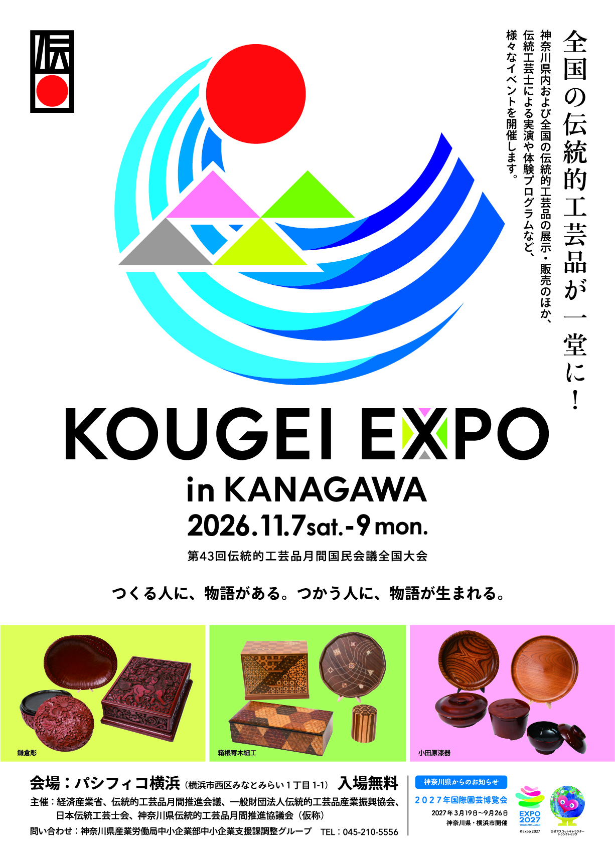 伝統的工芸品月間国民会議全国大会は、経済産業省が伝統的工芸品に対する国民の理解とその一層の普及を目指し、1984年から、毎年11月を伝統的工芸品月間と定め、その中心イベントとして、毎年開催地を変えて全国各地で開催しているもので、第43回目となる令和8年度大会は、神奈川県として初めての開催となります。